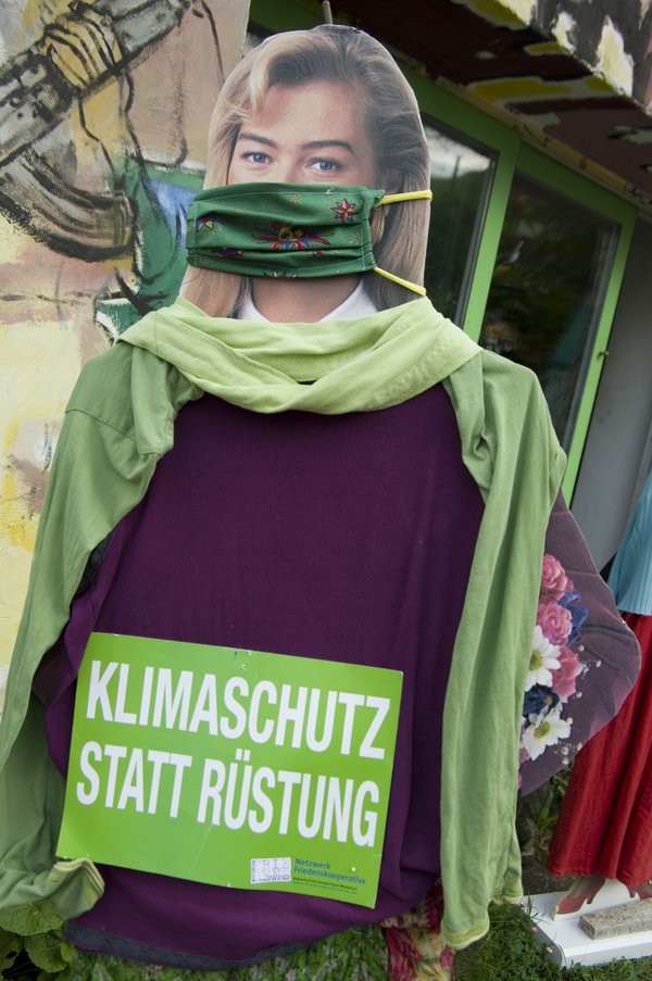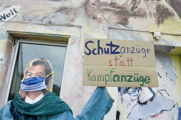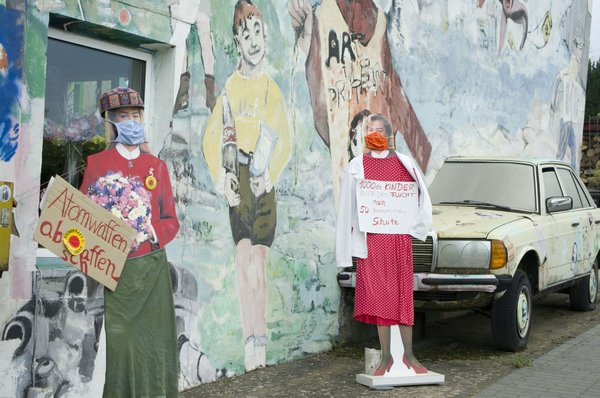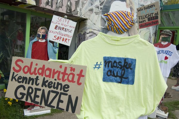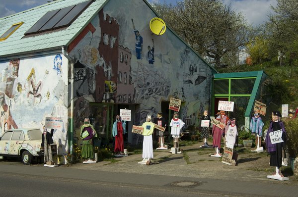 Annamalt schrieb: "Da Ostermärsche, öffentliche Versammlungen und Aktionen zur Zeit nicht erlaubt sind, hat sich eine Schar von 16 demonstrierenden Frauen (Pappfiguren) auf meinem Hof versammelt. Übrigens stehen die Damen alle der aktuellen Vorschrift entsprechend in gebührendem Abstand , tragen zudem Mundschutz und sorgen so dafür, dass sie sich nicht gegenseitig anstecken könnnen. Die Spaziergänger, Radfahrer und Autofahrer waren sehr erfreut über diesen ungewöhnlichen Ostermarsch und grüßten auf Distanz mit einem Daumen hoch. Die Kunstaktion ist an den Ostertagen von Samstag bis Ostermontag bei mir am bunten Haus in Föhren aufgebaut."